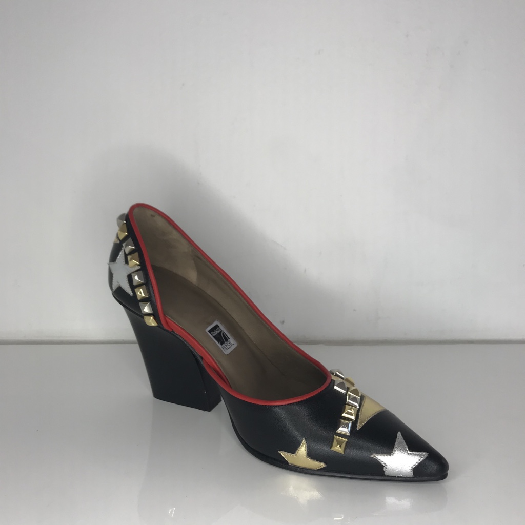 spitzer Pumps, innen geöffnet mit Sternapplikationen, besonderer Blockabsatz und die Nieten runden das ganze ab