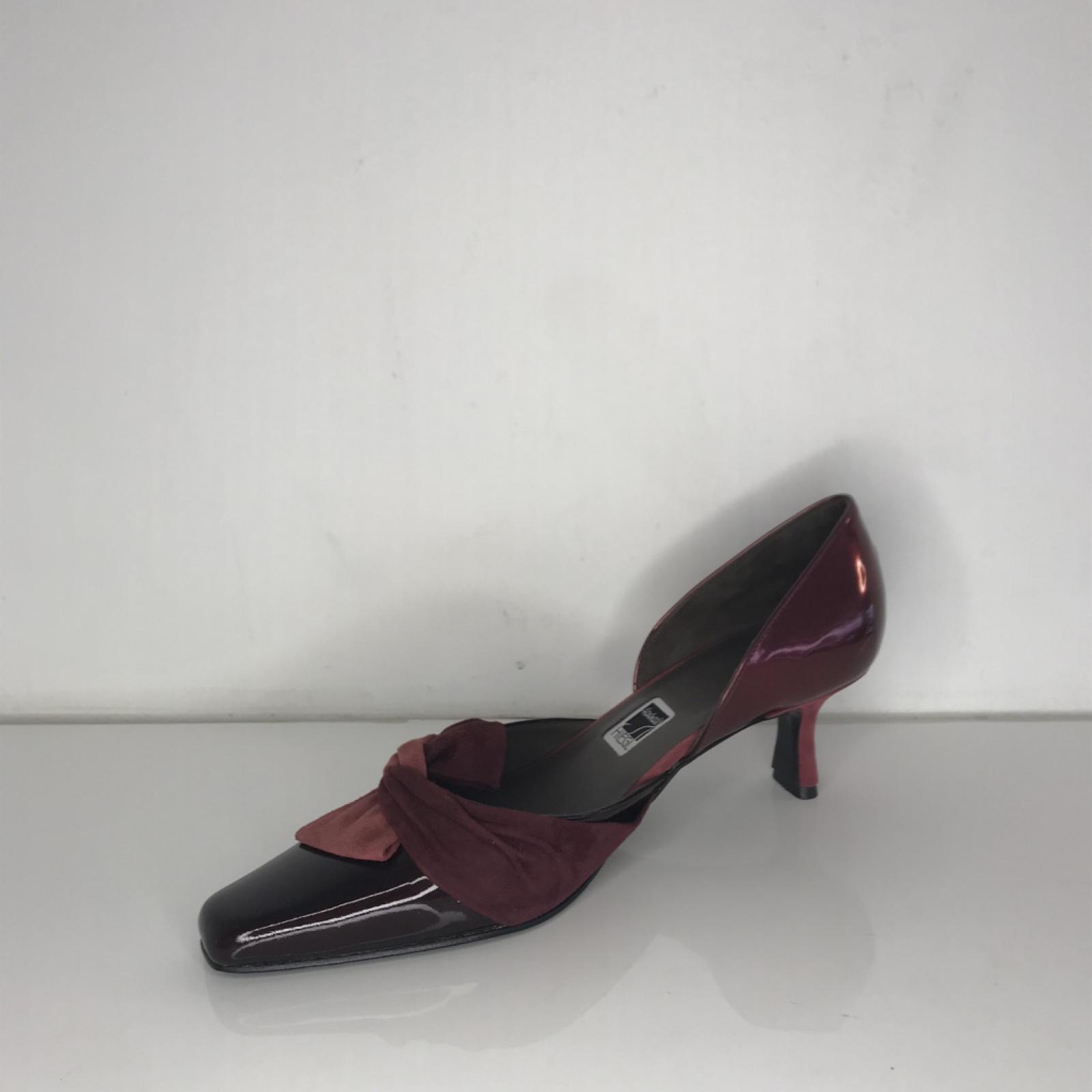 in Vorderblatt und Ferse geteilter Pumps mit vorne gebundenen Bändern und einer Absatzhöhe von circa 5 cm