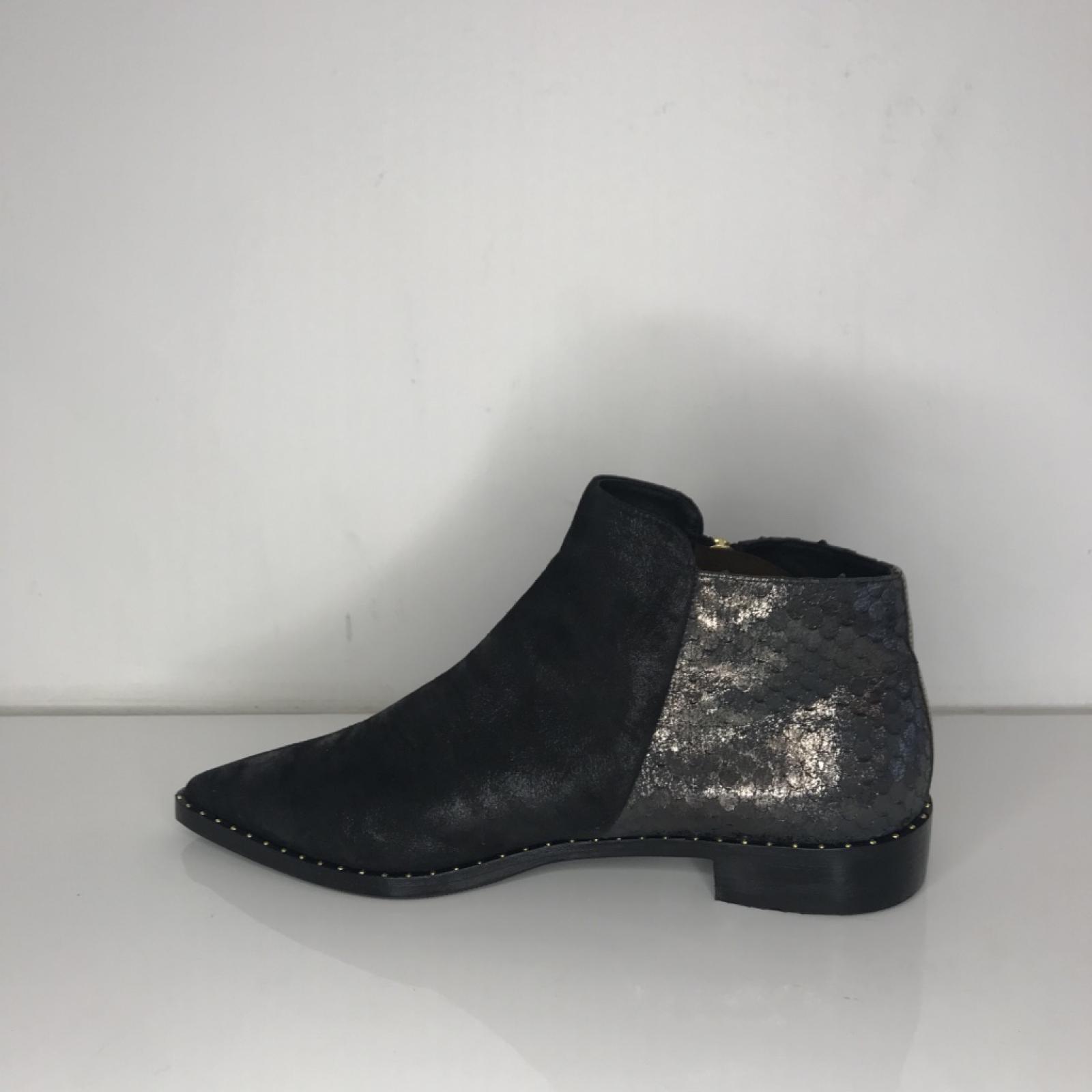 kurze spitze Stiefelette mit Statement Reissverschluss aussen, kleinem Leder Aufbauabsatz